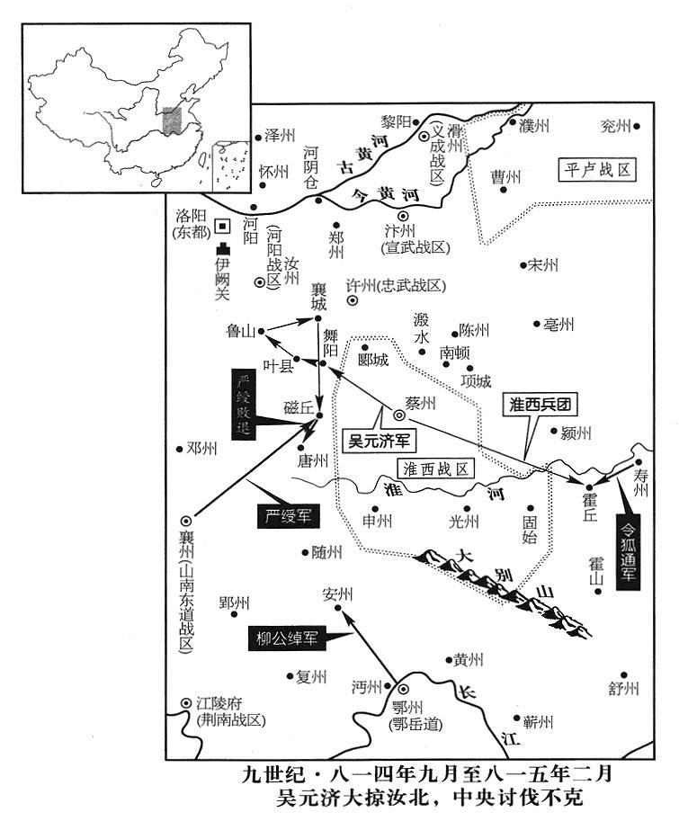 2、彰义(淮西)战区(总部设蔡州“〔河南省汝南县〕”)变军首领吴元济指挥他的军队四出掳掠抢劫,逼近东都洛阳(河南省洛阳市)近郊。