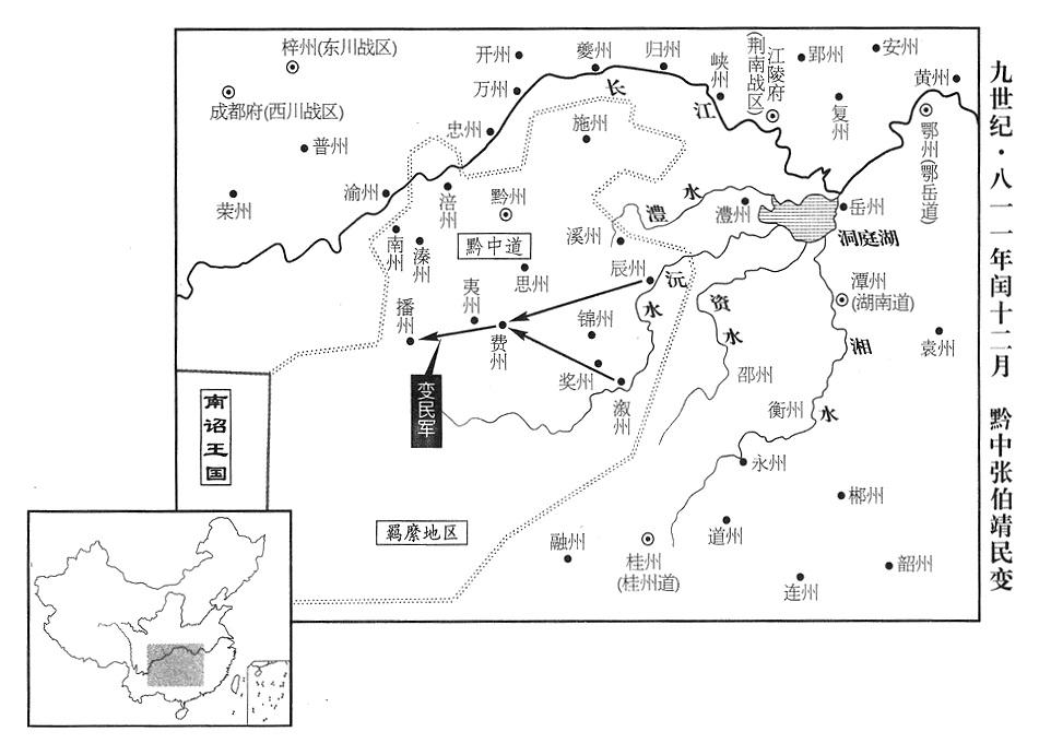 18、闰十二月一日,黔中道上疏奏报说:辰州、溆州二州变民首领张伯靖进攻播州(贵州省遵义市)、费州(贵州省思南县)。