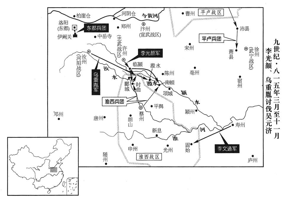 8、吴元济派使节向成德战区(总部设恒州“〔河北省正定县〕”)及平卢战区(总部设郓州“〔山东省东平县〕”)求救。成德战区司令官王承宗、平卢战区司令官李师道屡次上疏皇帝,请求赦免吴元济,李纯不准。当时,李纯动员各战区出军讨伐吴元济,只没有调发平卢战区,平卢战区司令官李师道派大将率军两千人,直向寿春(寿州州政府所在县·安徽省寿县),宣称协助中央军讨伐吴元济,实际上想乘机援救吴元济。