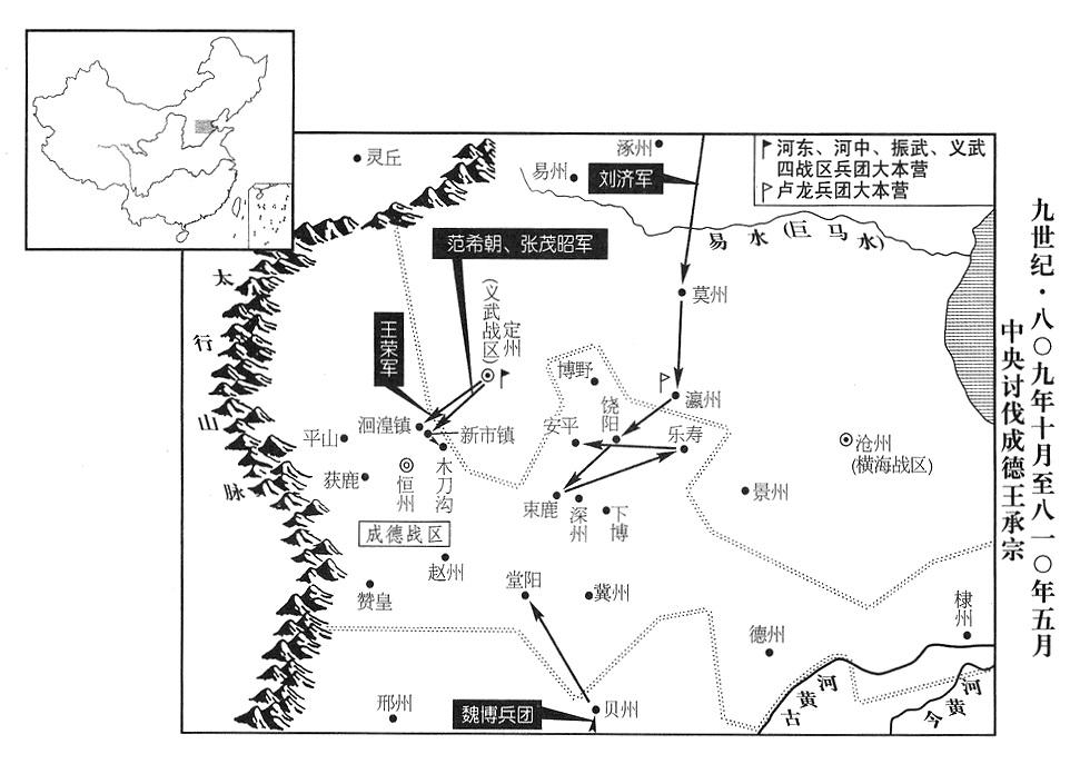 23、李纯下诏命振武战区(总部设单于府“〔内蒙古和林格尔县〕”)派军两千人,会同义武战区(总部设定州“〔河北省定州市〕”)特遣兵团,共同讨伐成德变军(总部恒州)首领王承宗。