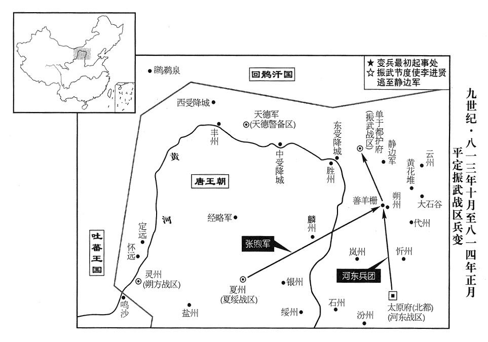 3、河东战区将领刘辅格杀丰州(内蒙古五原县)州长燕重旰(丰州属天德警备区“〔总部天德军城〕”)。战区司令官王锷诛杀刘辅以及刘辅的同党。