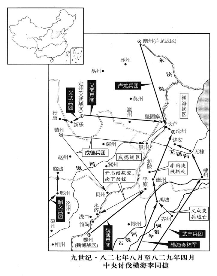 6、二月,横海战区(总部设沧州“〔河北省沧州市东南〕”)司令官李祐,率各战区特遣兵团攻击横海战区(总部沧州)变军首领李同捷,把变军击破;乘胜继续进攻德州(山东省陵县。德州属横海战区)。