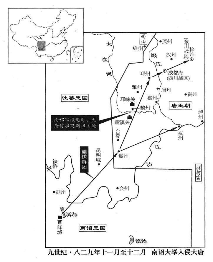 25、十一月二十日,西川战区(总部设成都府“〔四川省成都市〕”)司令官杜元颖奏报说:“南诏王国(首都苴咩城“〔云南省大理市〕”)武装部队侵入我国边境!”