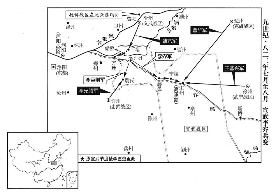 9、昭义战区(总部设潞州“〔山西省长治市〕”)司令官刘悟离开郓州(山东省东平县)时(参考八一九年二月),率郓州官员两千人跟随自己。