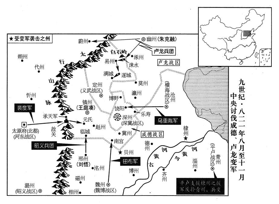 13、中央政府收到刘悟的遗疏,文武百官议论纷纷,很多人认为:上党(潞州州政府所在县·山西省长治市)是内地战区,跟河朔(河北平原)三镇不同,不可以允许。