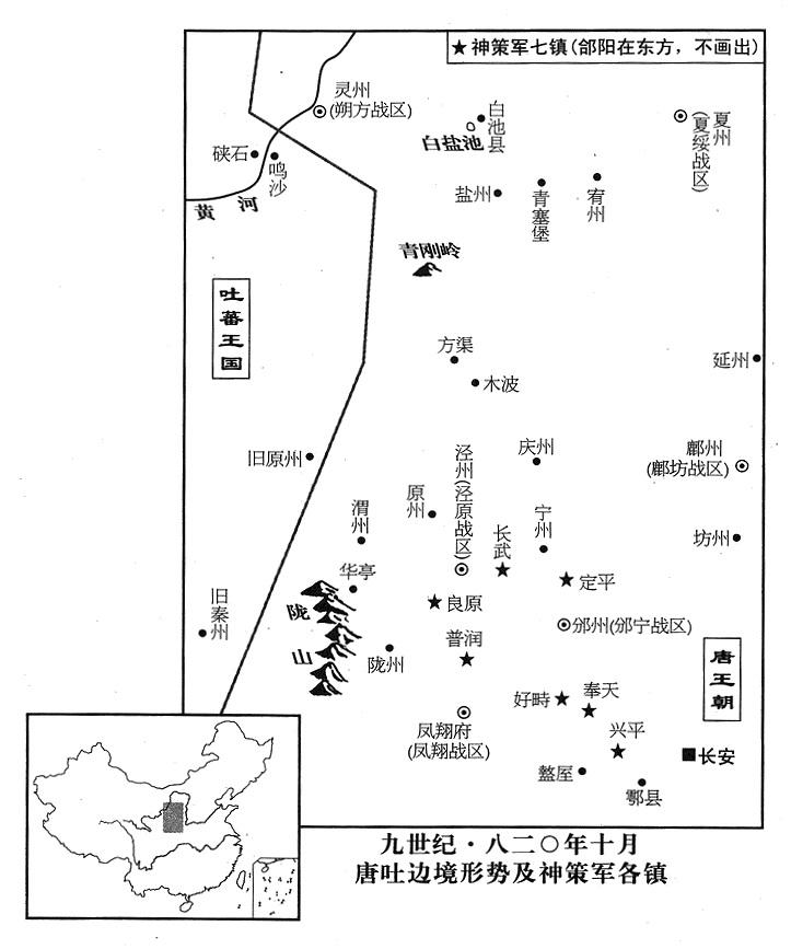 34、十月十四日,泾原战区(总部设泾州“〔甘肃省泾川县〕”)奏报说:“吐蕃军推进到距泾州三十里处扎营。”请中央紧急救援。李恒命右神策军总指挥宦官(右军中尉)梁守谦当左右神策军京师西北特遣兵团总监(西北行营都监),率军四千人,并动员八镇驻兵(神策军有八个基地:长武“〔陕西省长武县西北〕”、兴平“〔陕西省兴平市〕”、好畤“〔陕西省永寿县西南〕”、普润“〔陕西省凤翔县北〕”、郃阳“〔陕西省合阳县〕”、良原“〔甘肃省灵台县西梁原镇〕”、定平“〔甘肃省正宁县西南〕”、奉天“〔陕西省乾县〕”),全军增援,赏赐将士制装费两万串。命郯王府政务秘书长(长史)邵同(郯王李经,是十三任帝李诵的儿子)当库藏部副部长(太府少卿)兼副总监察官(兼御史中丞),充当回应吐蕃王国的亲善友好特使(充答吐蕃请和好使)。
