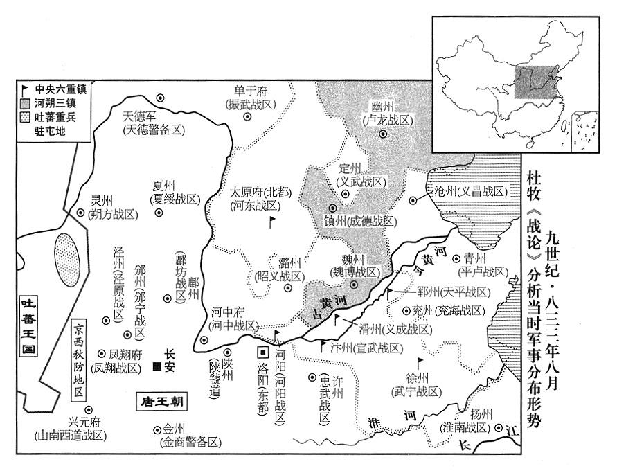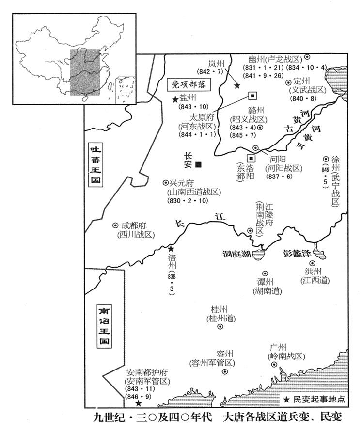 13、义武战区(总部设定州“〔河北省定州市〕”)司令官张璠在任十五年(据吴廷燮《唐方镇年表》考证,张璠于八二九年三月上任,迄今只十年),北邻卢龙战区(总部设幽州“〔北京市〕”)跟南邻成德战区(总部设镇州“〔河北省正定县〕”)都对他十分敬畏。张璠患病,上疏请求前往中央朝见。中央还没有作妥善安置,张璠病势转重,告诫他的儿子张元益,要率全族回归京师,不可效法河北三镇的军阀割据。张璠不久逝世,兵变爆发,拥护张元益继承统帅,道政府候补行政长官(观察留后)李士季反对,变军诛杀李士季,又诛杀大将十余人。