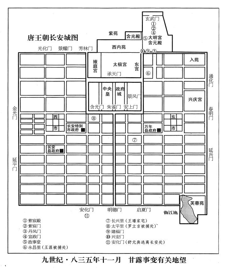 4、李昂跟宰相宋申锡密谋诛杀宦官(参考去年“〔八三〇年〕”六月),宋申锡推荐国务院文官部副部长(吏部侍郎)王璠当首都长安特别市长(京兆尹),把皇帝的秘密指示告诉他。想不到王璠却把消息泄露。宫廷机要室主任宦官(枢密使)王守澄跟他的智囊郑注得到消息,暗中布置。