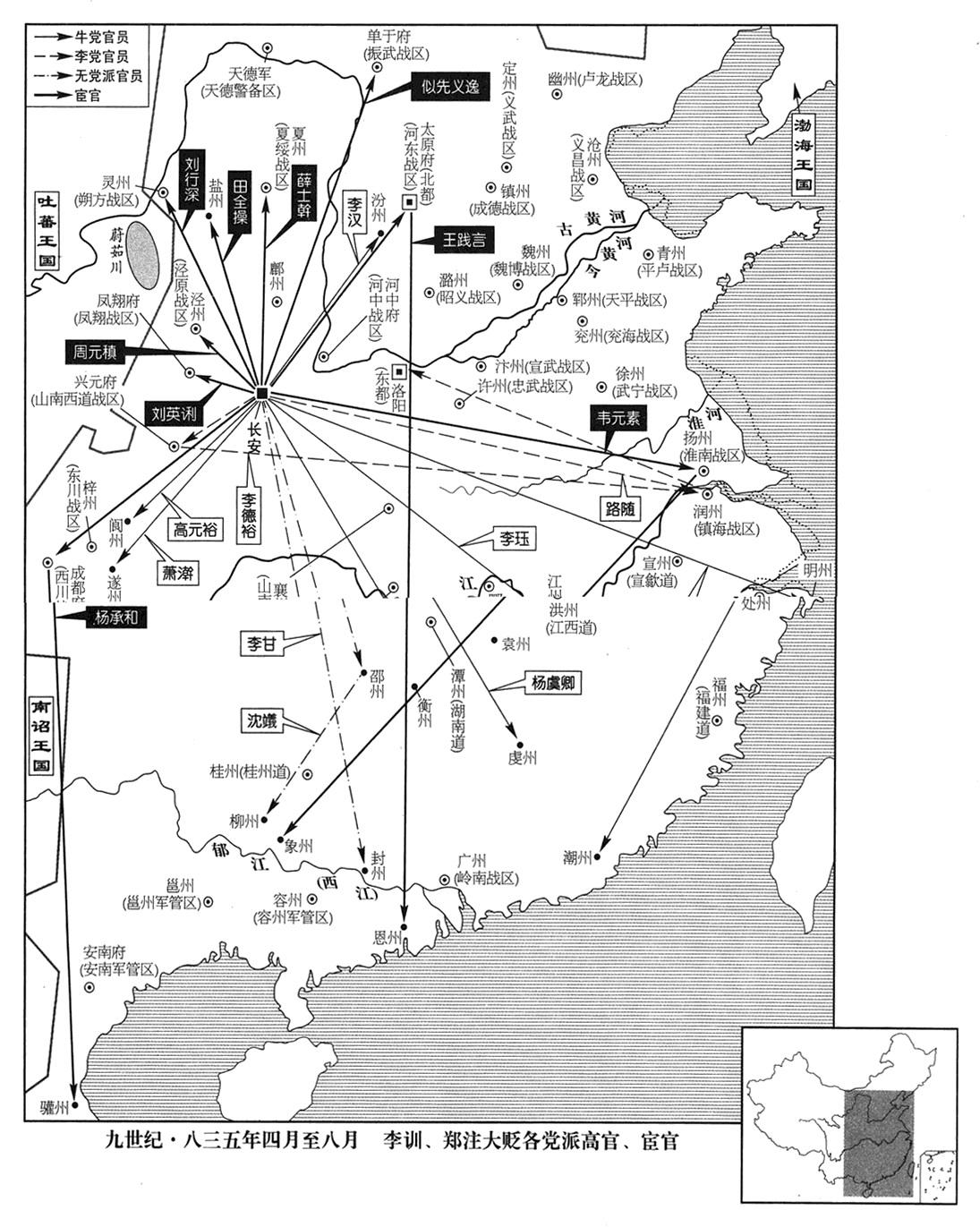 7、五月十九日,西川战区(总部设成都府“〔四川省成都市〕”)司令官李德裕奏报说:派使节前往南诏王国(首都苴咩城“〔云南省大理市〕”)索取当年掳掠去的平民(参考八二九年十二月),要回四千人。
