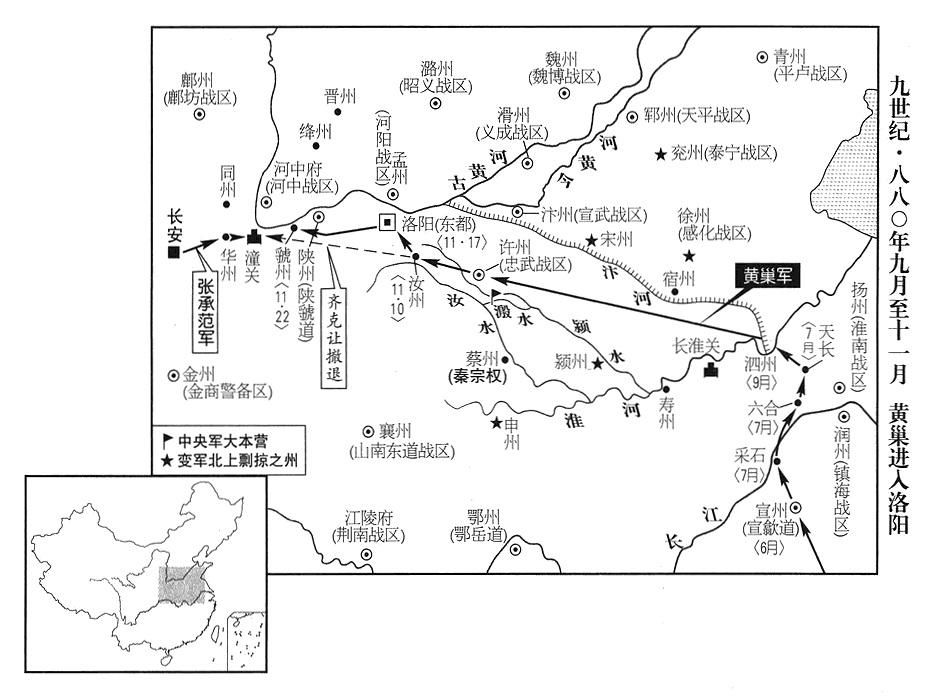 26、齐帝黄巢攻克长安时,唐政府忠武战区(总部设许州“〔河南省许昌市〕”)司令官周岌投降黄巢。