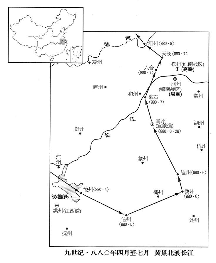 26、秋季,七月,黄巢自采石(安徽省马鞍山市西南)横渡长江北上,包围天长(安徽省天长市)、六合(江苏省六合县),声势十分强大。淮南战区将领毕师铎(原黄巢部将,降高骈,参考八七九年正月)警告高骈说:“帝国安危,中央依靠大帅,而今盗匪数十万,以如此庞大数目,乘战胜余威,长驱北上,如入无人之境,如果不能紧守险要,迎头痛击,他们一旦越过长淮关(安徽省蚌埠市东),就没有人可以控制,一定成为中原的灾难!”可是高骈因各战区道特遣兵团早已遣返,大将张璘又死,自己知道没有能力阻止黄巢前进,心里畏惧,不敢出军,只命各将领加强戒备,保守阵地,并且上疏向中央报告情况紧急,说:“盗匪六十余万人进驻天长,距我所在的扬州城(江苏省扬州市)不到五十里。”