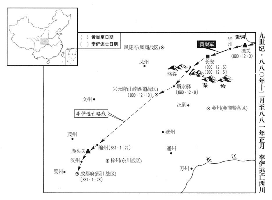 十一月十二日,冬至,李俨登延英殿,对着宰相,惶恐焦急,流泪哭泣。皇家观察兵马阵容最高监军宦官(观军容使)田令孜奏报说:“请准我遴选左右祌策军弓箭部队,前去守卫潼关(陕西省潼关县),我愿充当总指挥军政围堵司令官(都指挥制置把截使)。”李俨说:“禁卫将士不熟悉战场厮杀,恐怕没有用处。”田令孜说:“从前,安禄山叛变,玄宗(九任帝李隆基)前往蜀中避难!”崔沆说:“安禄山只有五万人,比起黄巢,不能相提并论。”豆卢瑑说:“哥舒翰有十五万大军,仍守不住潼关(应是十八万大军,参考七五六年六月),现在黄巢大军有六十万,而潼关却没有哥舒翰的庞大军队。幸好田令孜为帝国着想,事先都有安排,三川战区司令官都是他的心腹(西川“〔成都府〕”陈敬瑄、东川“〔梓州〕”杨师立、山南西道“〔兴元府〕”牛勖),比起玄宗,现在可是早有准备。”李俨大不高兴,对田令孜说:“你姑且替我派军防守潼关!”