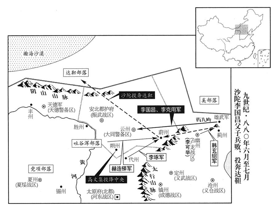 2、沙陀(山西省北部)变军(参考八七八年五月)进入雁门关(山西省代县西北),攻击忻(山西省忻州市)、代(山西省代县)二州。