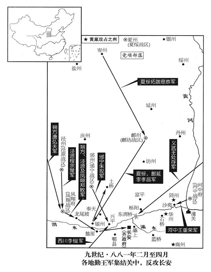 这时候,唐弘夫(作战参谋长)进驻渭水以北,王重荣(河中候补司令官)进驻沙苑(陕西省大荔县东南),王处存(义武司令官)进驻渭桥,拓跋思恭(夏绥暂代司令官)进驻武功(陕西省武功县西),郑畋(凤翔司令官)进驻盩厔(陕西省周至县)。唐弘夫乘龙尾陂战胜余威,进逼长安。