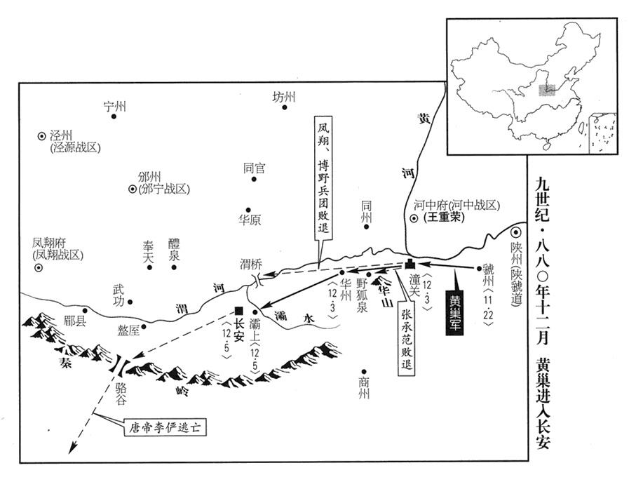 2、唐政府凤翔战区(总部设凤翔府“〔陕西省凤翔县〕”)司令官郑畋(音tián“〔田〕”),会合前朔方战区(总部设灵州“〔宁夏灵武市〕”)司令官唐弘夫、泾原战区(总部设泾州“〔甘肃省泾川县〕”)司令官程宗楚,一同攻击齐帝黄巢。齐政府派将领王晖携带诏书召见郑畋,郑畋斩王晖,派儿子郑凝绩前往皇帝流亡所在地,郑凝绩紧急赶路,赶到汉州(四川省广汉市),才赶上李俨。