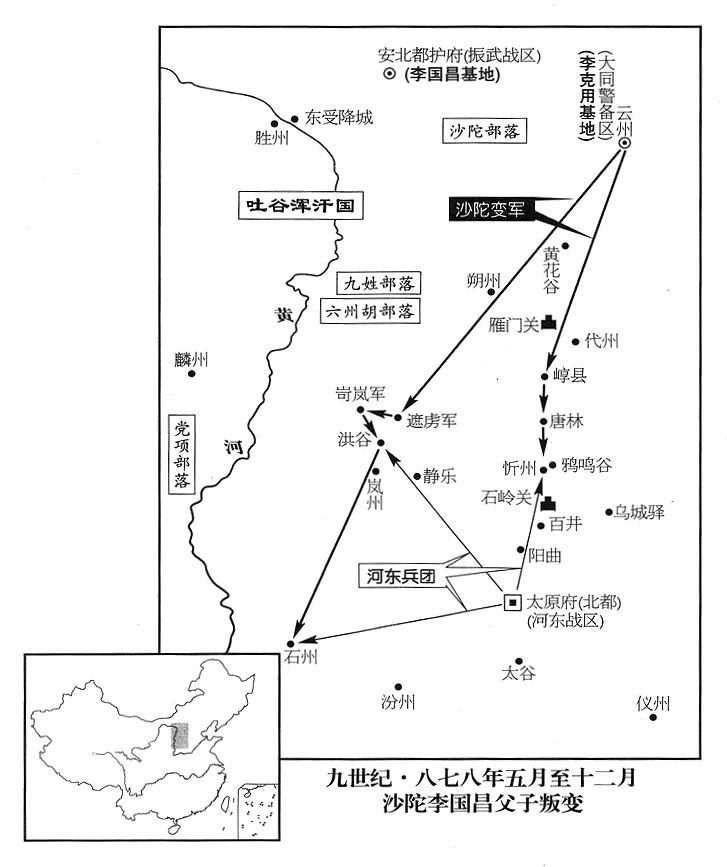 4、振武战区(总部设安北府“〔内蒙古和林格尔县〕”)司令官李国昌(朱邪赤心)的儿子李克用,是沙陀军副作战司令(沙陀副兵马使),驻防蔚州(河北省蔚县)。当时,黄河以南民变纷纷爆发,云州(大同警备区总部·山西省大同市)沙陀军作战司令(沙陀兵马使)李尽忠,跟营门官(牙将)康君立、薛志勤、程怀信、李存璋等,互相商议说:“而今,天下大乱,中央号令,已不能推行全国,这正是英雄豪杰建立功名、追求富贵的良机。我们虽然都手握军队,可是司令官(李国昌“〔朱邪赤心〕”)功劳大,地位高,名闻天下,他的儿子(李克用)勇敢善战,超过其他所有部众,如果拥护他起事,代北(山西省北部)地带,很容易平定。”大家完全同意。康君立,是兴唐(蔚州州政府所在县)人。李存璋,是云州人。薛志勤,是奉诚(内蒙古宁城县西南)人。