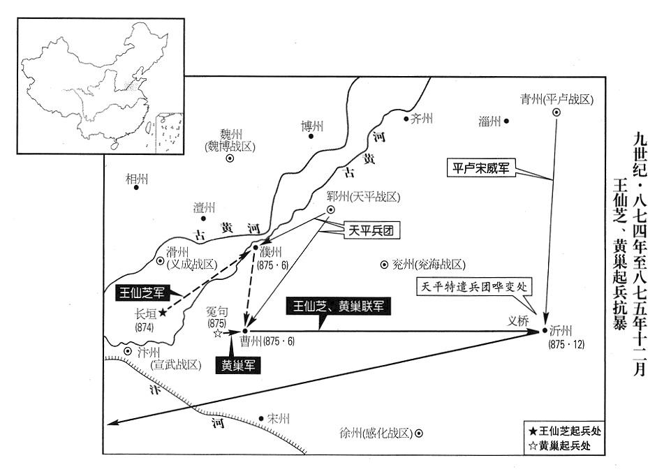 7、徐州变军溃散后(参考八六九年九月六日),残兵败将,仍散布各地当强盗,遍及兖州(山东省兖州市)、郓州(山东省东平县)、青州(山东省青州市)、齐州(山东省济南市)一带乡间。