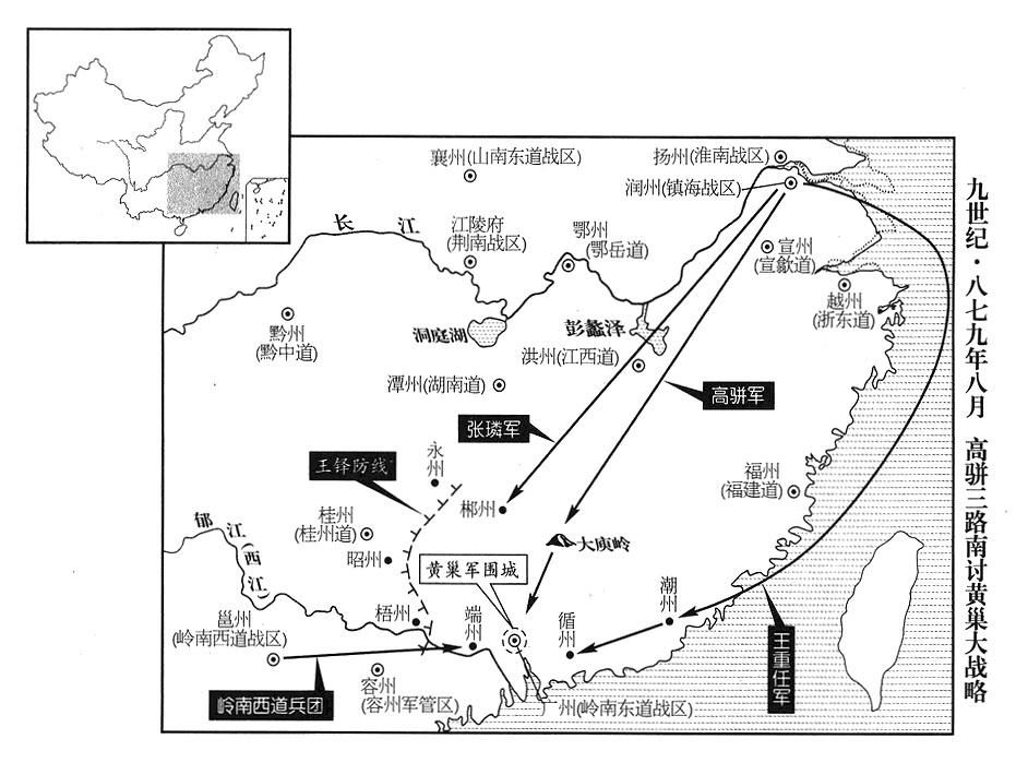 15、镇海战区(总部设润州“〔江苏省镇江市〕”)司令官高骈上疏提出征剿黄巢大战略,高骈说:“我建议命舒州(安徽省潜山县)暂任州长郎幼复当候补司令官(留后),留守镇海战区。另派总作战司令(都知兵马使)张璘率军五千人据守郴州(湖南省郴州市)险要;候补作战司令(兵马留后)王重任率军八千人,进驻循(广东省惠州市)、潮(广东省潮州市)二州,准备拦击;我自己率军一万人,越过大庾岭(五岭“〔南岭〕”之一),直向黄巢大本营广州。黄巢听说我亲自前往,一定逃走,请诏令王铎率士卒三万人,据守梧(广西梧州市)、桂(广西桂林市)、昭(广西平乐县)、永(湖南省永州市)四州险要,严阵以待(根据《新唐书·高骈传》,高骈建议王重任南攻,乃是循海路而进。另外,又建议岭南西道战区“〔总部邕州〕”派军驻守端州“〔广东省肇庆市〕”)。”