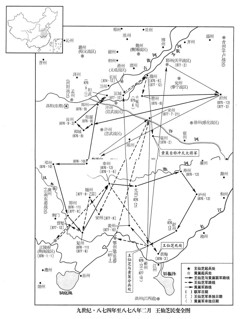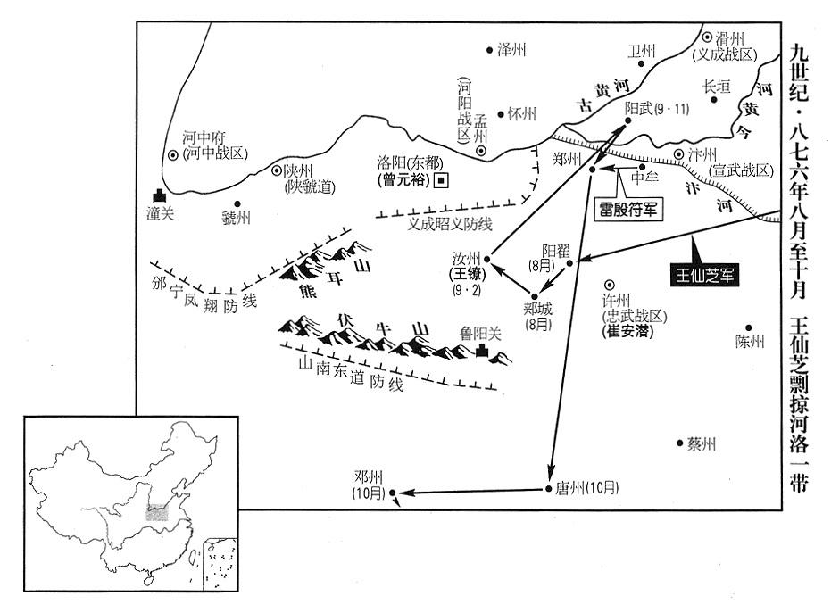 9、长垣变民另一首领、王仙芝的余党王重隐,攻陷洪州(江西省南昌市);江西道(首府设洪州)行政长官(观察使)高湘,逃奔湖口(江西省湖口县)。变民军转往剽掠湖南道(首府设潭州“〔湖南省长沙市〕”),别动部队将领曹师雄剽掠宣州(宣歙道首府·安徽省宣州市)、润州(镇海战区总部·江苏省镇江市)。