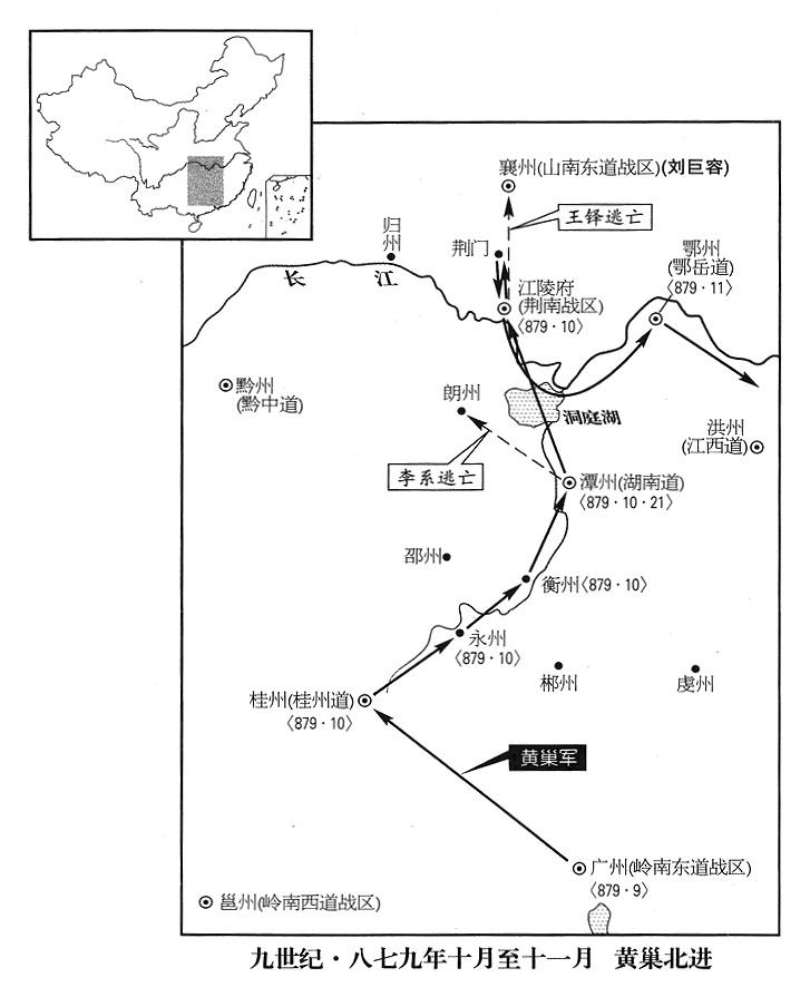 18、黄巢在岭南(南岭以南),士卒受瘴气瘟疫传染,死亡十分之三四,高阶层干部劝他回北方图谋大事,黄巢接受。遂自桂州编制大木筏数十条,乘着山洪暴发,水势湍急,顺湘江而下,经过衡州(湖南省衡阳市)、永州(湖南省永州市),十月二十一日,抵达潭州(湖南道首府·湖南省长沙市)城下。唐政府副总指战官(行营副都统)李系登城固守,不敢出战,黄巢急行攻击,只一天,便把城攻破,李系逃往朗州(湖南省常德市)。黄巢下令屠杀政府军所有士卒,尸首塞满湘江,顺流而下。变民军将领尚让乘胜逆长江而上,进逼江陵(荆南战区总部·湖北省江陵县),号称大军五十万。当时,各战区道特遣兵团还没有集结完成,江陵守军不满一万人。总指战官(都统)王铎心胆俱裂,命他的部将刘汉宏留下来保护江陵,而自己率部众逃奔襄阳,声称跟山南东道战区司令官刘巨容会师。再料不到,王铎离开之后,刘汉宏立刻发动兵变,在江陵大肆剽掠,纵火焚烧,全城几乎平为废墟,人民逃窜山谷。不巧又遇上大雪,满山遍野都是被杀死、或被冻死饿死的僵尸。十余天后,冤句变民军才到。刘汉宏,是兖州人,于烧杀抢劫之后,率领部众北返,正式成为盗匪。