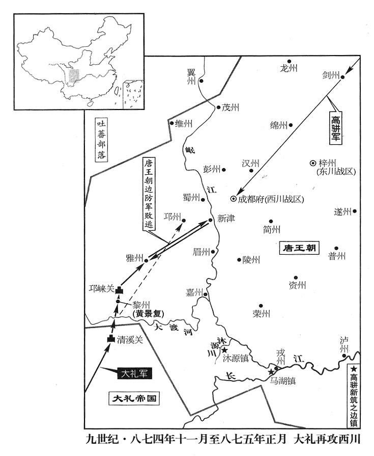 2、西川战区(总部设成都府“〔四川省成都市〕”)居民听到大礼帝国(首都苴咩城“〔云南省大理市〕”)远征军就要进入国土,大为恐慌,争先恐后投奔成都(四川省成都市)逃生。可是成都只筑有子城(第二道城墙),外面又没有壕沟,难民每人只有一张草席那么大的地方,落雨的时候,大家就用瓢盆、簸箕、斗笠勉强遮掩。当地又没有水井,喝的水都要到摩诃池(成都市东南角)汲取泥浆,等到沉淀澄清后才能饮用。