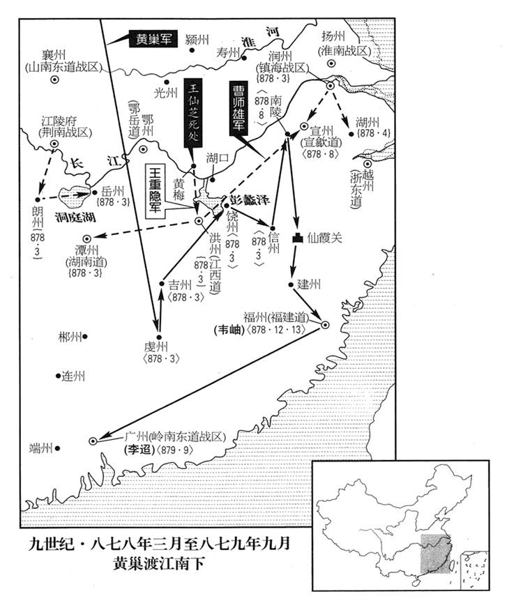 22、冤句变民首领、冲天大将军黄巢进攻宣州(安徽省宣州市),宣歙道(首府宣州)行政长官王凝抗拒,在南陵(安徽省南陵县)被击败,但黄巣不能攻克城池,于是率军渡长江南下,攻击浙东(首府设越州“〔浙江省绍兴市〕”),凿开山路七百里,进入福建(首府设福州“〔福建省福州市〕”),剽掠各州(《新唐书·黄巢传》记载,黄巢军自江西“〔江西省〕”开凿山路,直趋建州“〔福建省建瓯市〕”,可知采取的是仙霞岭“〔浙江省江山市西南〕”路线,变军实际上并没有攻击浙东首府越州)。