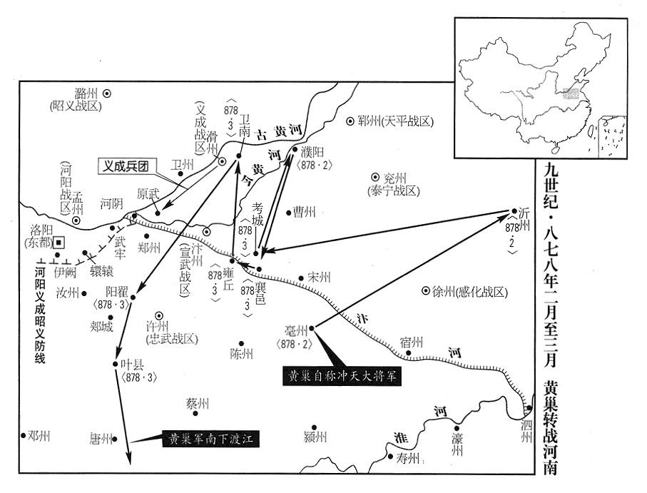 2、镇海战区(总部设润州“〔江苏省镇江市〕”)司令官(节度使)高骈,派将领张璘、梁缵,分道攻击冤句(山东省东明县南马头集)变民首领、冲天大将军黄巢(参考八七八年二月),屡次把变民军击败,黄巢手下将领秦彦、毕师铎、李罕之、许勍等数十人,分别投降。黄巢遂转向广南(岭南·南岭以南)。秦彦,是徐州(江苏省徐州市)人。毕师铎,是冤句人。李罕之,是项城(河南省沈丘县)人。