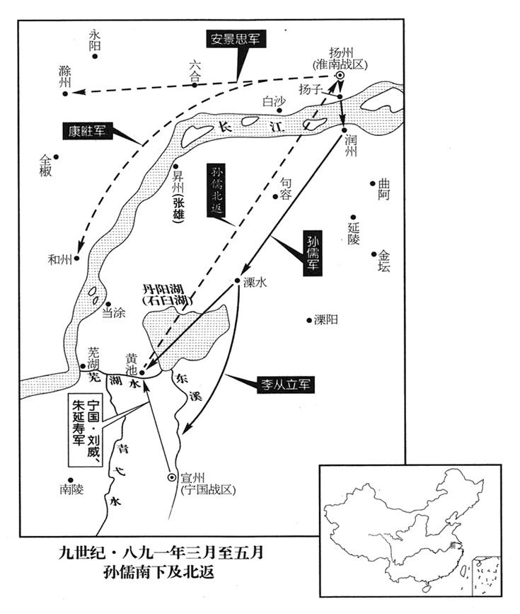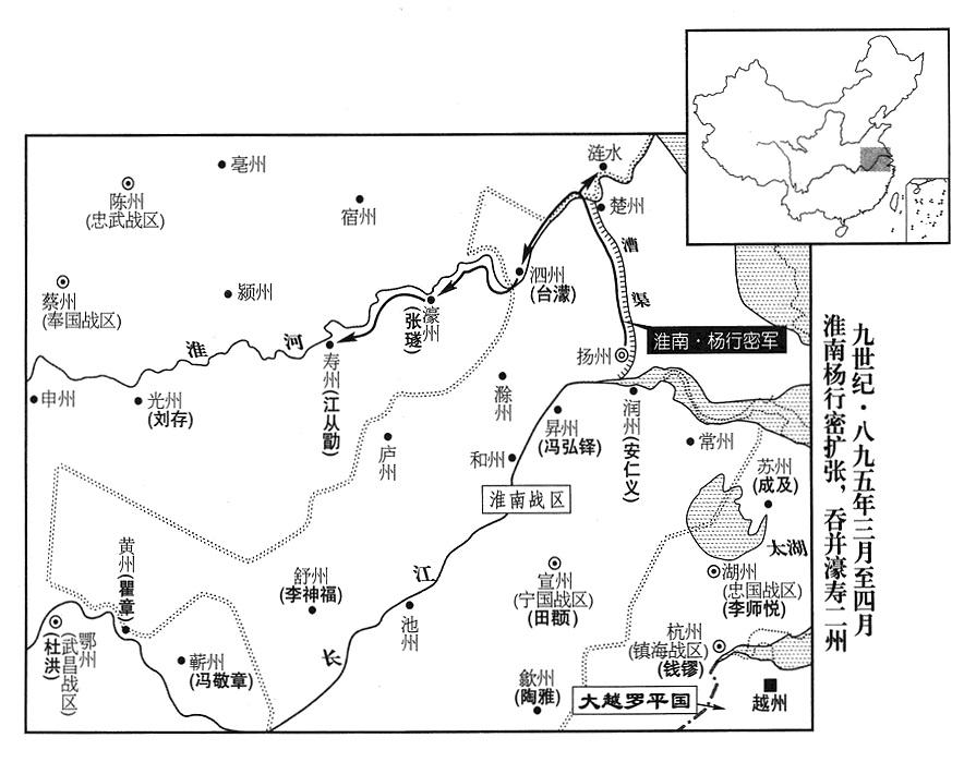 3、淮南战区(总部设扬州“〔江苏省扬州市〕”)司令官孙儒,集合淮南基本部队、蔡州(河南省汝南县)兵团所有兵力,渡长江南下。