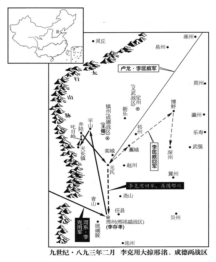2、河东战区(总部设太原府“〔山西省太原市〕”)司令官(节度使)李克用猛烈攻击邢州(河北省邢台市),东昭义战区(总部设邢州)司令官孟迁力量枯竭,粮食也吃完,不能支持,于是逮捕前来协防的宣武(总部汴州)将领王虔裕,制伏他所率的军队(王虔裕协防事,参考八八九年六月),献出城池,投降李克用。(孟方立据昭义战区山东“〔太行山以东〕”三州,参考八八二年十二月。传弟孟迁,前后九年而败。)