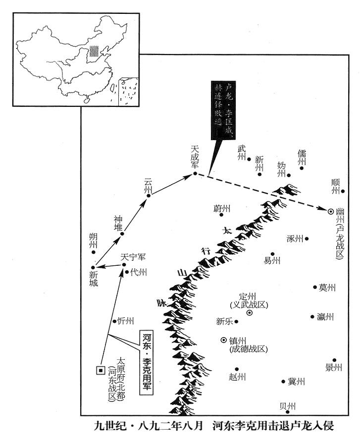 9、李克用率军进攻大同(云州·山西省大同市)警备区司令(防御使)赫连铎(二人早已结怨,参考八八〇年七月),攻克东城。赫连铎向卢龙战区(总部设幽州“〔北京市〕”)司令官李匡威求救,李匡威率军三万人增援。