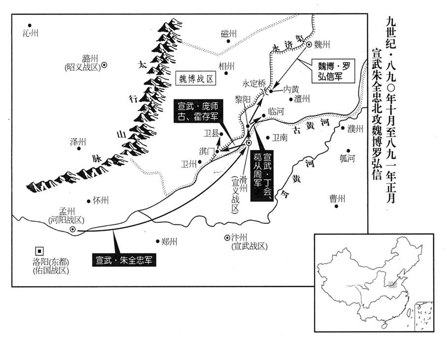 朱全忠遂自黎阳(河南省浚县)渡黄河北上,进攻魏博(总部魏州)。