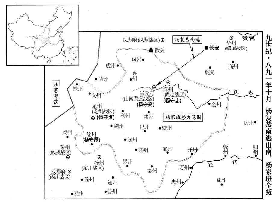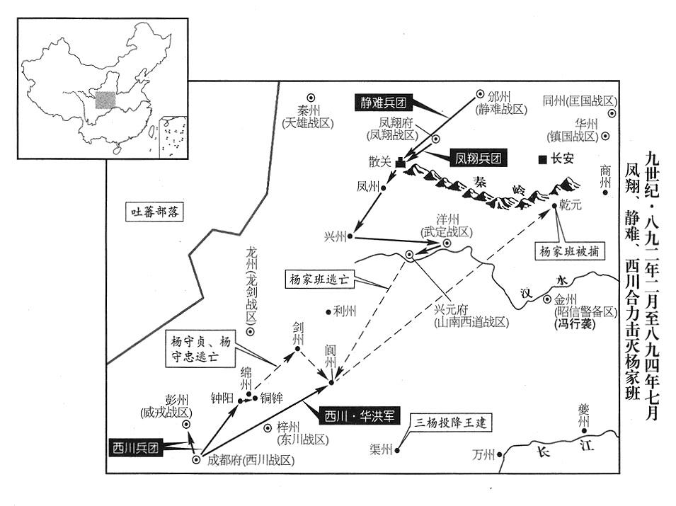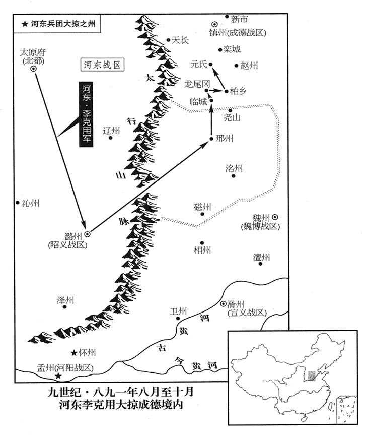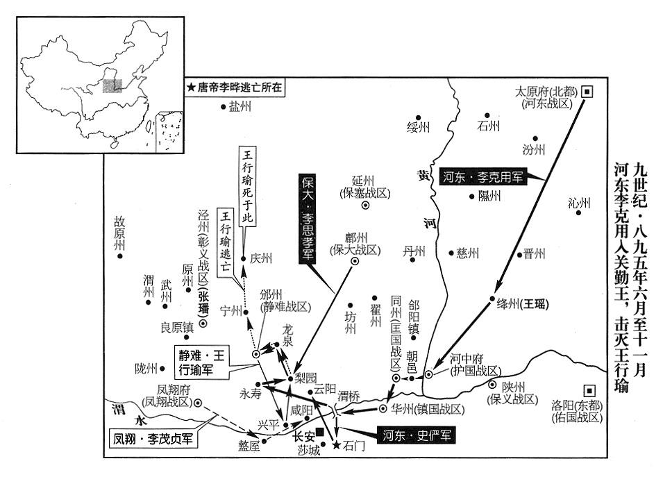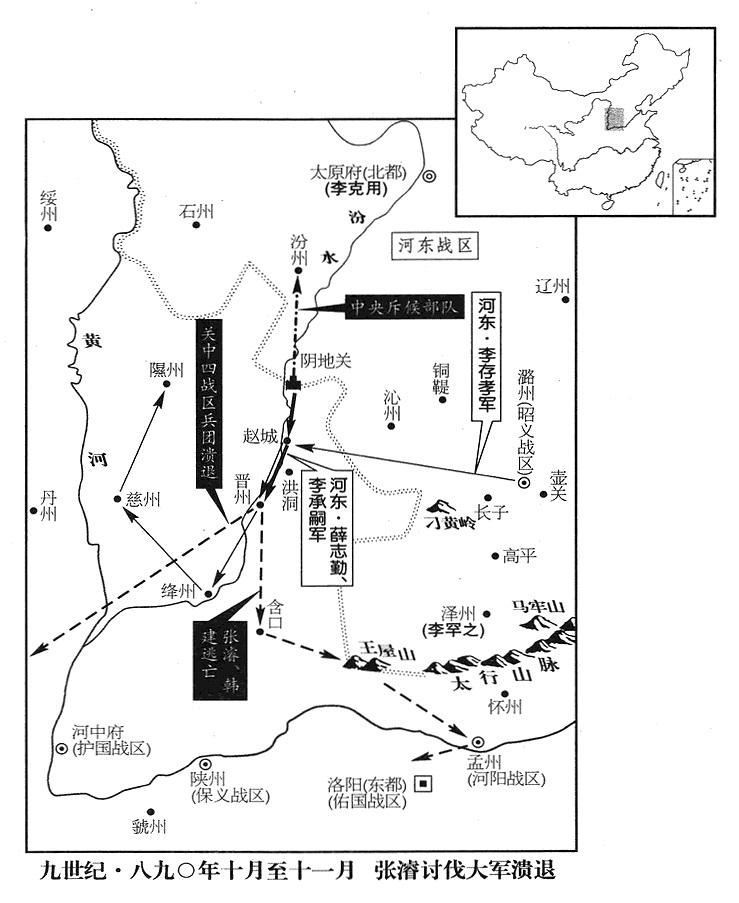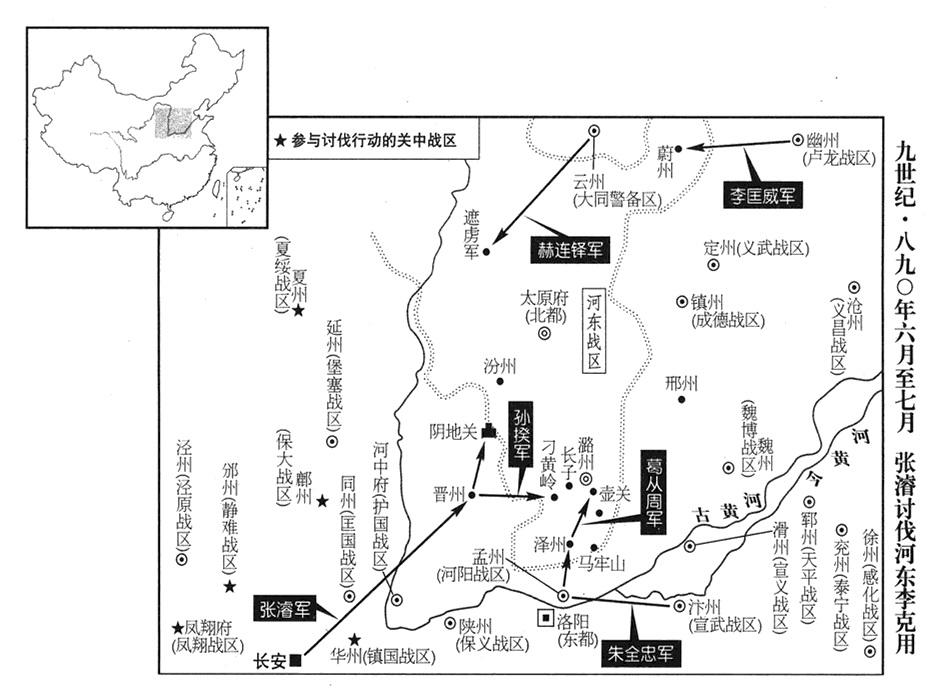 20、张濬在晋州(山西省临汾市)跟宣武(总部汴州)、镇国(总部华州)、静难(总部邠州)、凤翔(总部凤翔府)、保大(总部鄜州)、定难(总部夏州)等战区特遣兵团会师。
