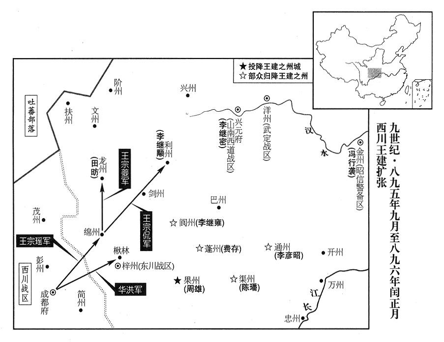 40、王建(西川“〔总部成都府〕”司令官)派简州(四川省简阳市)州长王宗瑶(姜郅)等率军北上勤王。