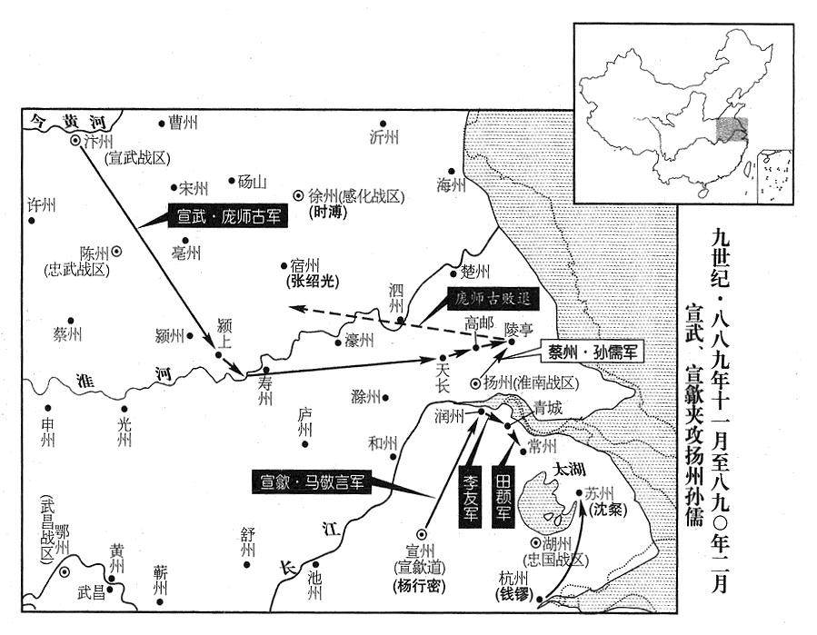 4、宣武战区(总部设汴州“〔河南省开封市〕”)总指挥官(都指挥使)庞师古等率领号称十万人的大军,渡淮河南下,声言讨伐杨行密(杨行愍·宣歙“〔首府宣州〕”行政长官),攻陷天长(安徽省天长市)。
