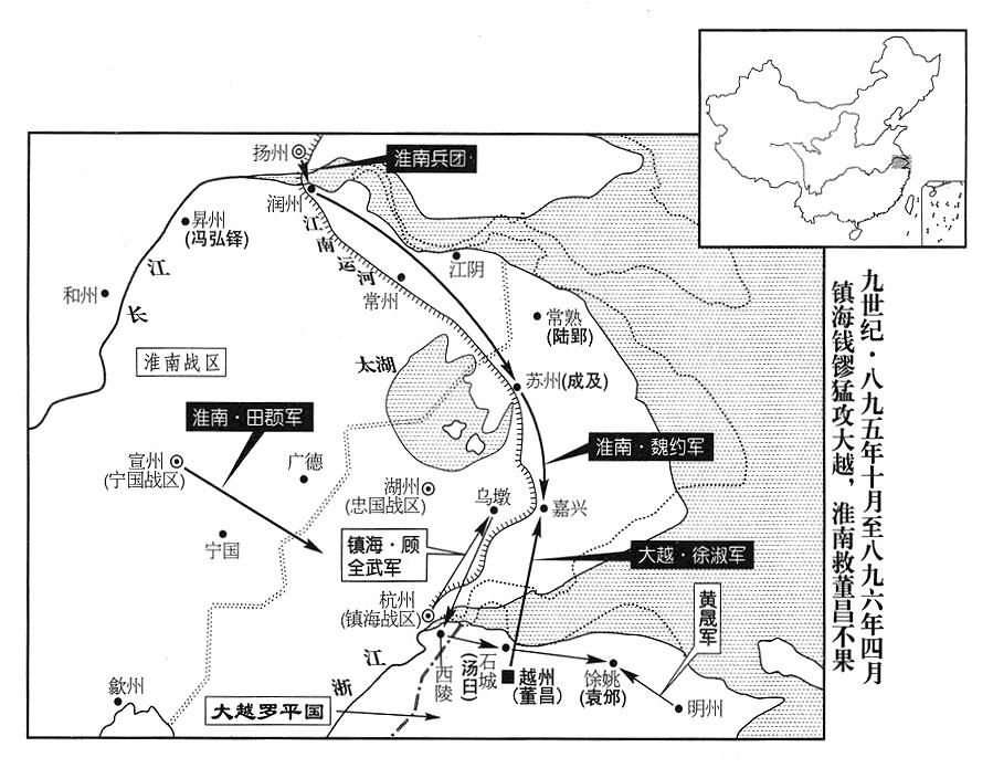 47、杨行密派宁国战区(总部设宣州“〔安徽省宣州市〕”)司令官田頵、润州(江苏省镇江市)民兵司令(团练使)安仁义,攻击杭州(镇海战区)境内各地方军事单位,以纾解董昌(罗平国皇帝)所受的压力,董昌派湖州(浙江省湖州市)将领徐淑,会合淮南(总部扬州)将领魏约,共同包围嘉兴(浙江省嘉兴市)。钱镠派武勇特别营司令(武勇都指挥使)顾全武增援嘉兴,一连击破乌墩(浙江省桐乡市西北乌镇)、光福(应在浙江省湖州市境)两个营寨。而淮南(总部扬州)将领柯厚也击破苏州水寨。顾全武是馀姚(浙江省余姚市)人。