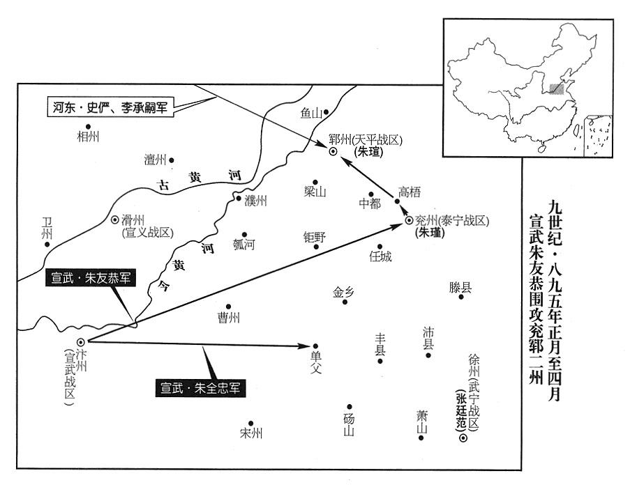 46、朱全忠派总指挥官(都将)葛从周攻击兖州(泰宁战区),而亲率主力部队继进。